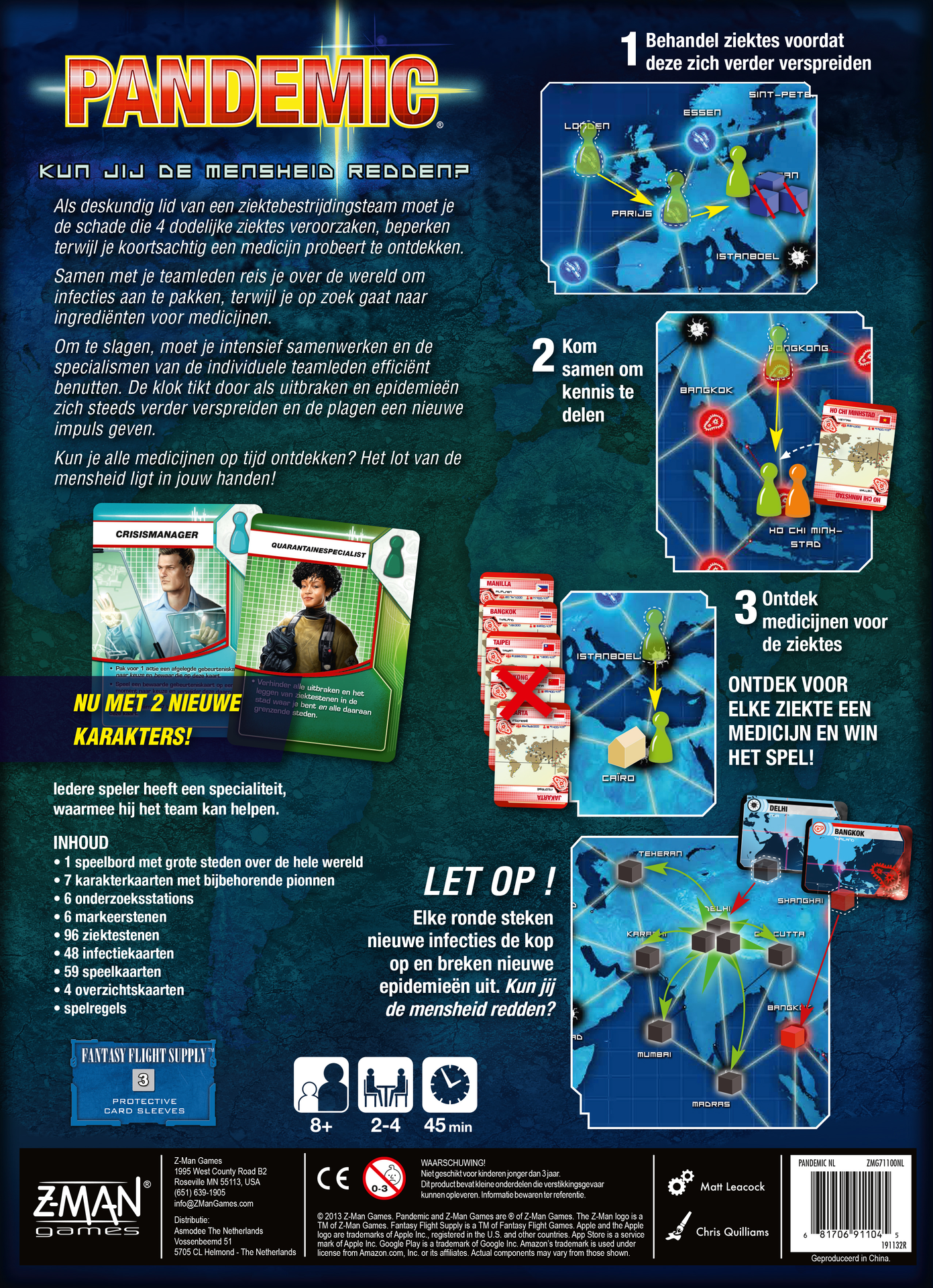 In dit coöperatief bordspel zijn de spelers leden van een eliteteam dat ten strijde trekt tegen vier bijzonder dodelijke ziektes (een pandemie uitbraak!). Het team reist over de hele wereld om de vloedgolf van infecties in te dammen en om kennis en hulpbronnen op te doen om medicijnen te ontwikkelen. Lukt het jou om de mensheid te redden?