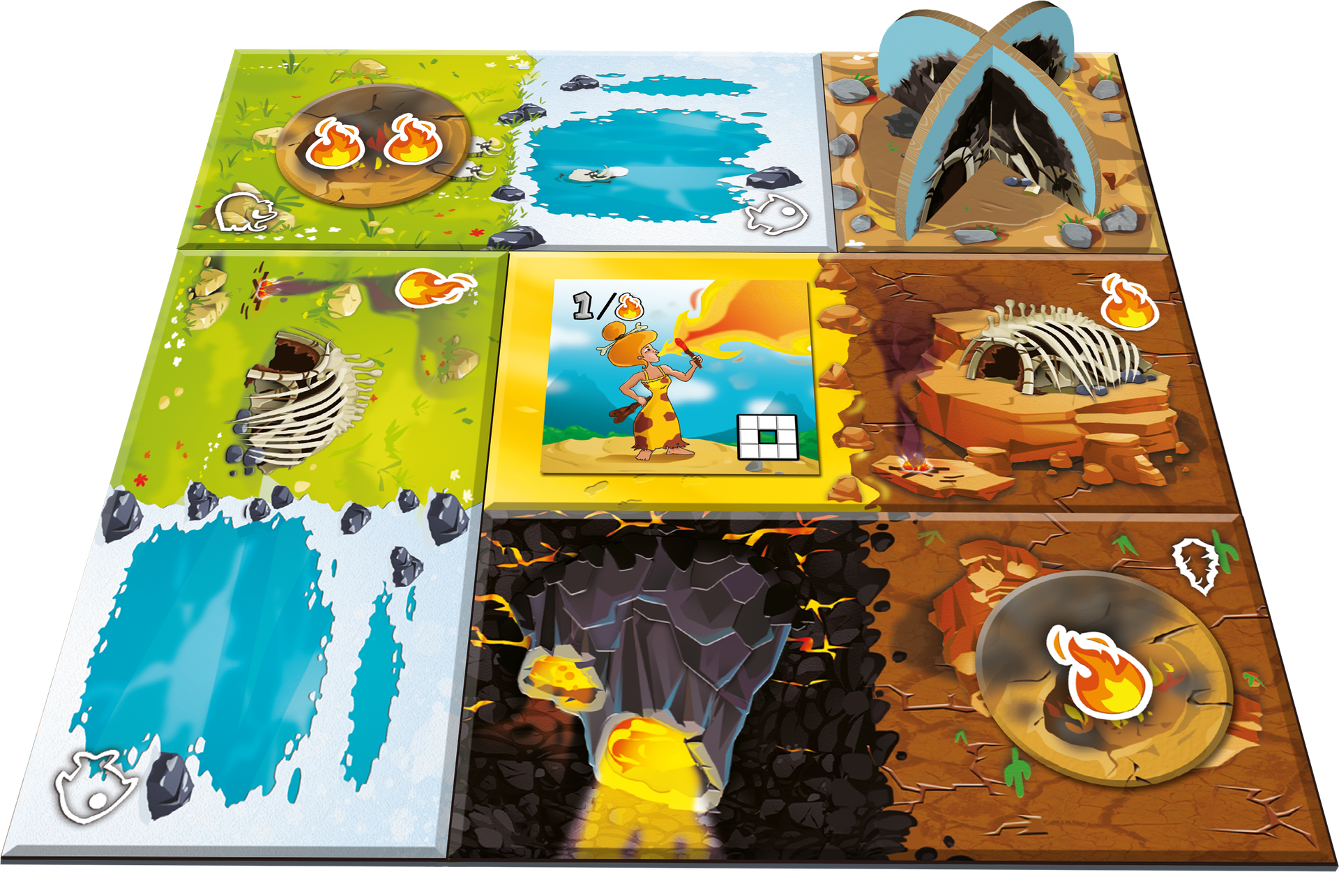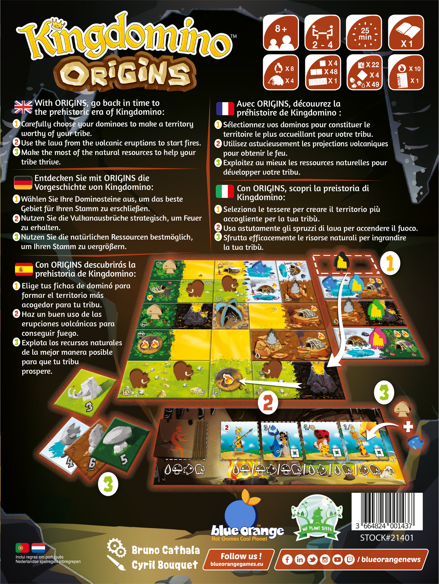 Gebruik de vulkaanuitbarstingen in Kingdomino Origins om vuur naar je verschillende regio’s te brengen en je stam zo goed mogelijk te laten ontwikkelen. Verzamel verschillende natuurlijke hulpbronnen: mammoeten, vissen, vuurstenen, paddenstoelen… en trek holbewoners aan om je stam en je jachtgebied uit te breiden.